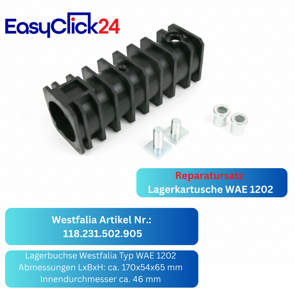 - Anwendung: Spezial-Lagerkartusche für Westfalia Auflaufeinrichtungen Typ WAE 1202. Zur fachgerechten Instandsetzung der Zugstangenführung bei Anhängern mit 46 mm Zugstangendurchmesser. Behebt Spiel in der Führung und sichert Bremsstabilität.